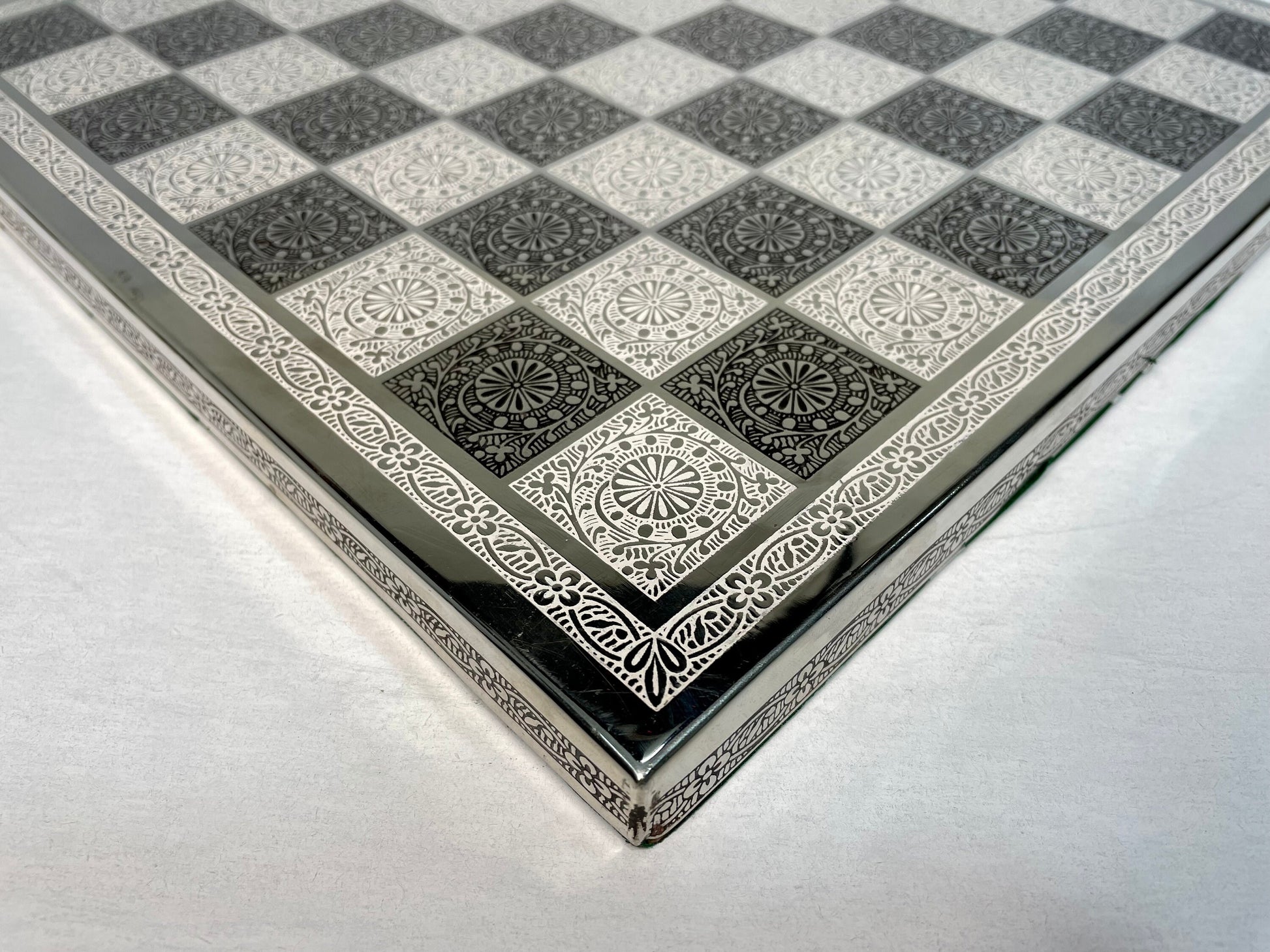 Modern classic carving chess set is a masterpiece among all the Brass Artistic chess sets due to its sleek modern design as the name suggests and the Hand carving on chess squares and chess pieces done by specially skilled craftsmen for this particular art form - bringing out the gold background carvings from black base.