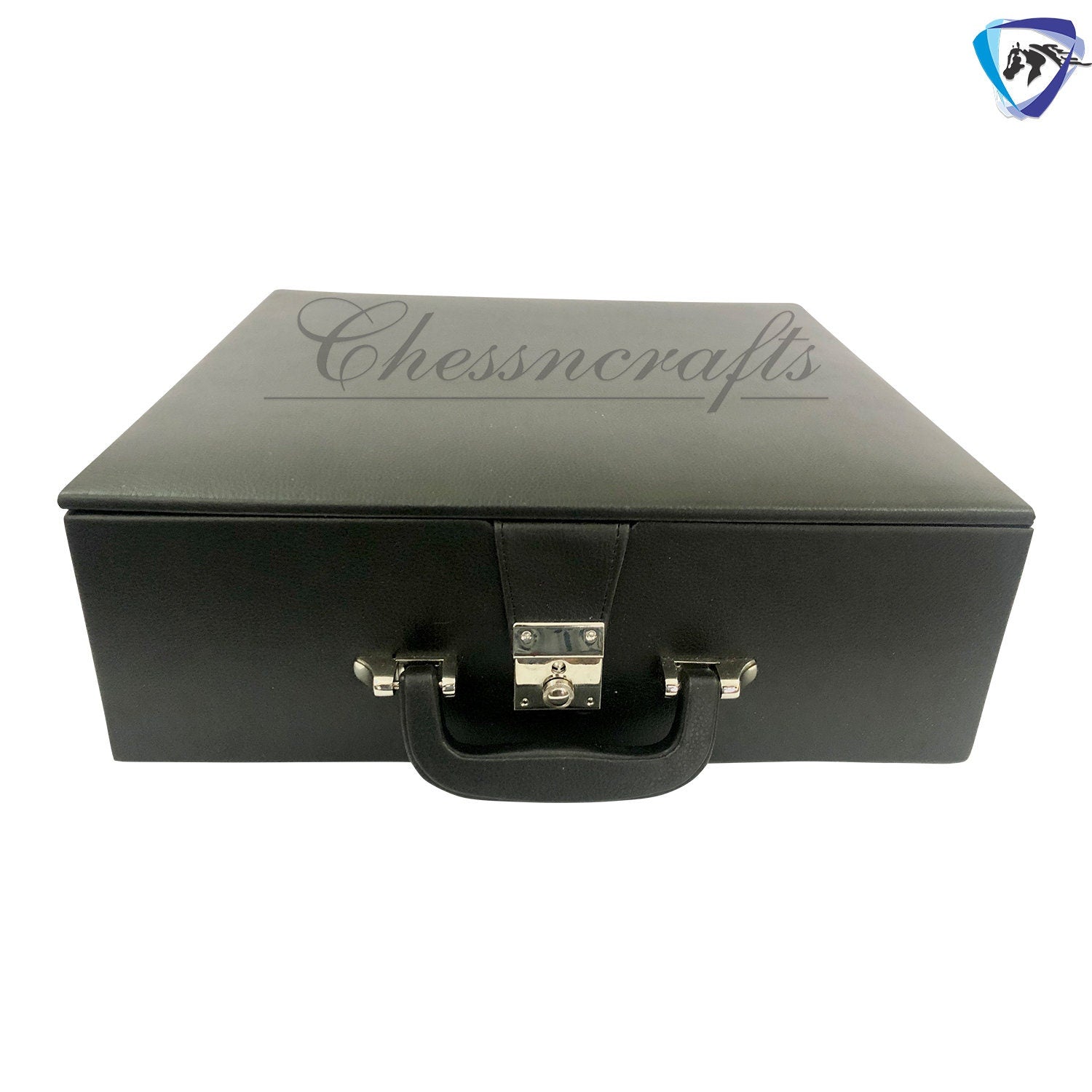Top Quality Chess Pieces storage box made of MDF Wood & Black Leatherette material with Lock & Handle.