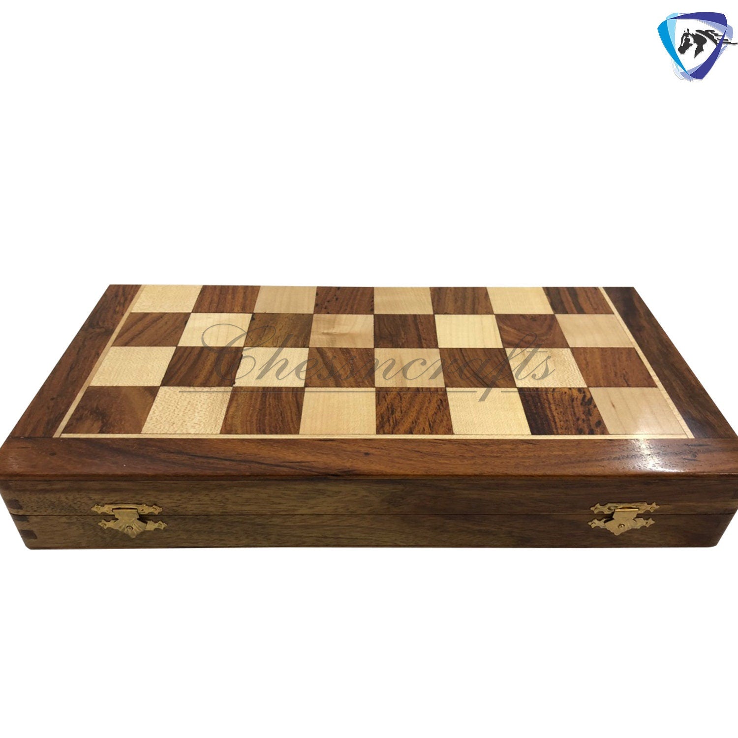 The Golden Rosewood(sheesham) is used to make the folding chess board with fine lacquered polish gives it a rich look, the special storage of chess men inside makes it a best combo chess set.